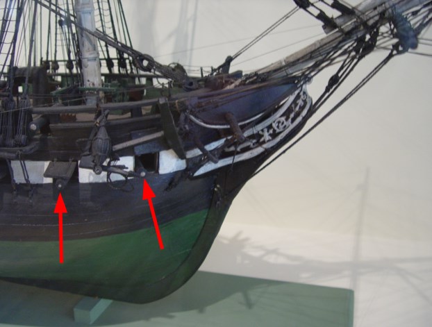 Was, wenn die vorderste Stückpforte nur verkleinert und zur Bridle-Port umgebaut wurde? Kanone raus, Abmessungen verkleinert, feste Läden ran und fertig? Steward ließ das Ganze dann wieder auf Original-Maße bringen? Wir werden es nie mit 100%iger Sicherheit erfahren, aber spekulieren macht SpaßMan hat den Eindruck: da passt doch dann kein Bridle-Port mehr daneben.