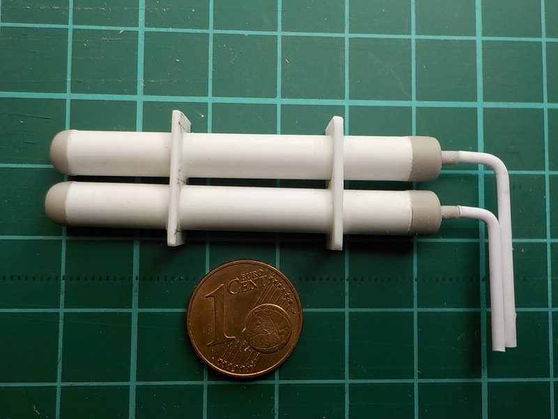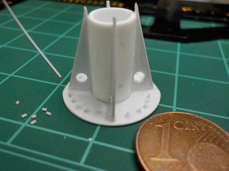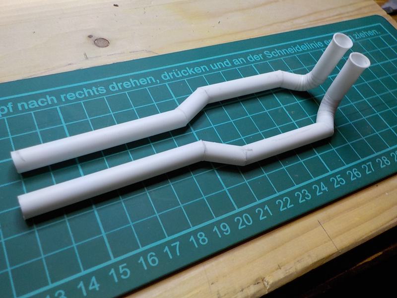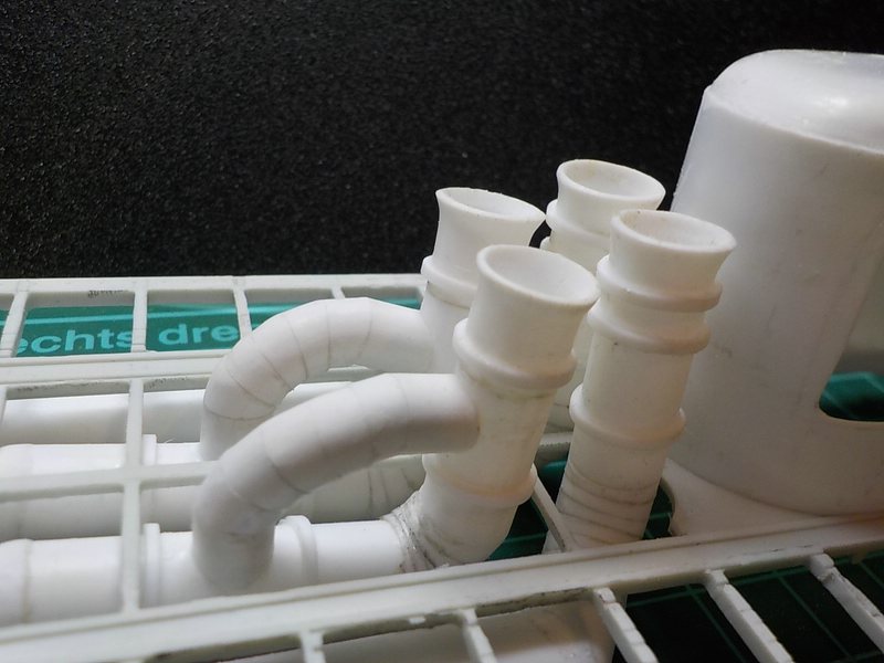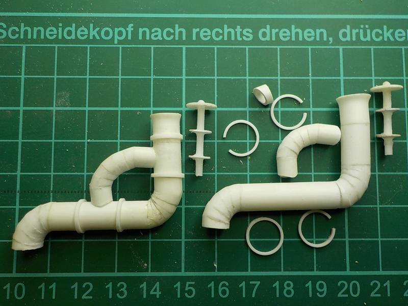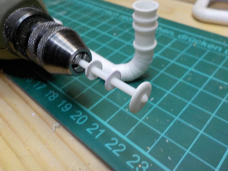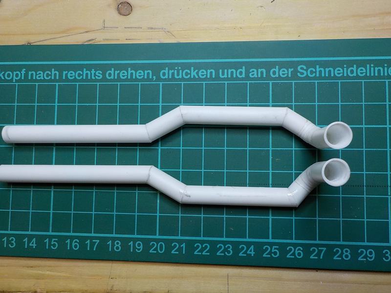 Turmrohr aus 7 mm Plastikrohr, Krümmerbogen 5 mm, da ich kein passendes Rohr für die Flanschstücke hatte, wurden diese „Ringe“ aus 9mm Rohr abgeschnitten und Material rausgenommen …
