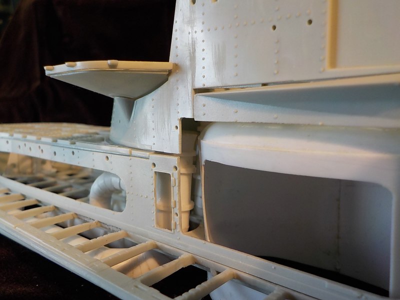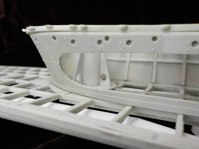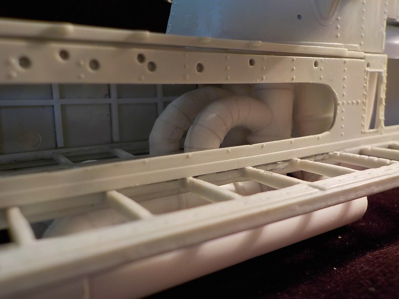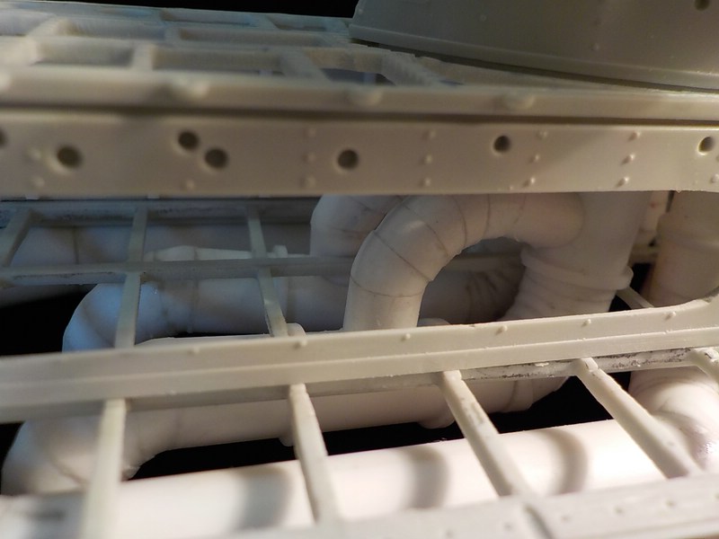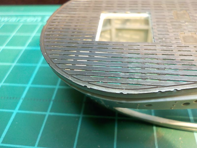 An die Diesellufttürme kamen die Rohre dran … die Ausbuchtung heckwärts ist notwendig, da sich hier die Frischlufttürme befinden.