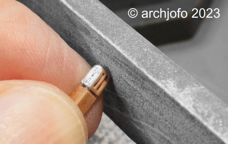 Die Länge der Geitaublöcke beträgt für die Großmarsrah fürs Modell  4 mm, wie auf dem nächsten Bild zu sehen. Daneben liegen bereits die Blockstroppen, vorbereitet zum einbinden.