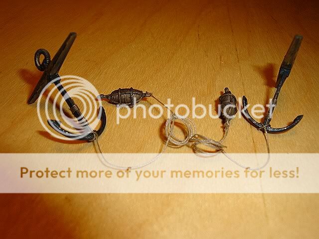 Die Ankerbojen sind nun auch bereits vertäut, da ich ja nun die dazu benötigten Wanten habe. Auch erkennt man hier bereits die weitere Verwendung meines Fockuntersegelkardeels nebst dem selbst gedremeltem Violinblock.