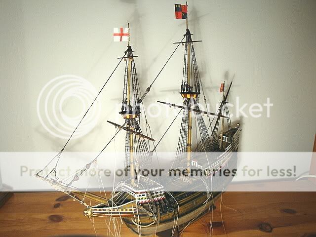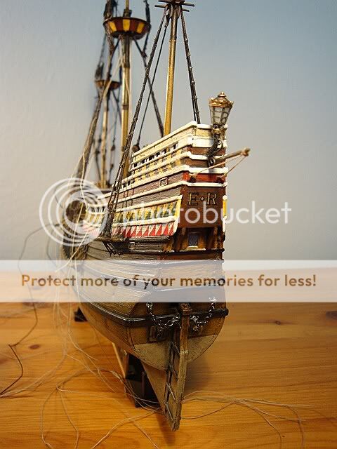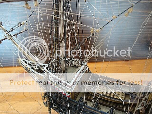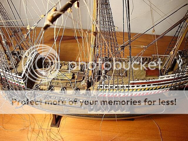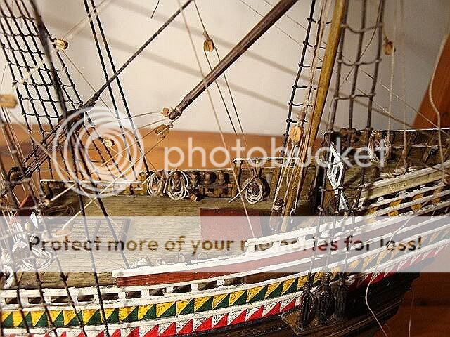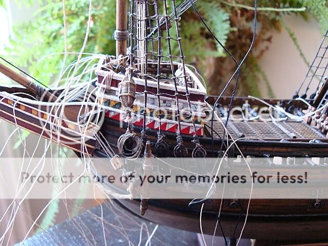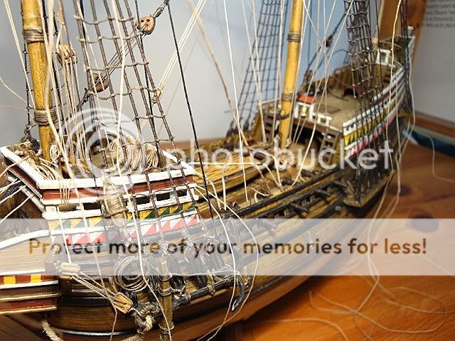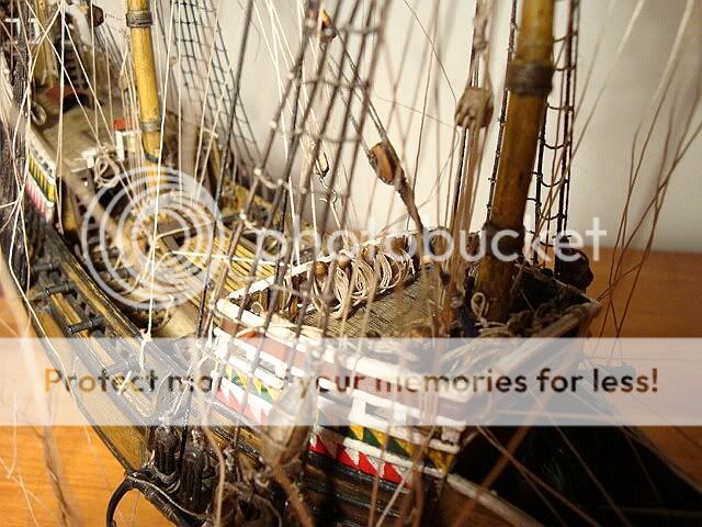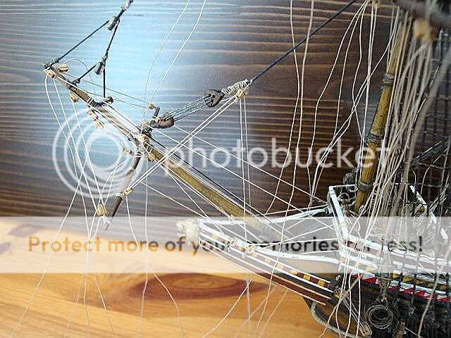 Die Wanten, die ich wieder mal in meiner "Gummilitzen-Technik" hergestellt habe sind soweit okay geworden, allerdings kommen sie ehrlich gesagt mit den hier im Forum gezeigten "Konventionellen" stellenweise nicht mit, finde ich jedenfalls. Schön ist, dass sie immer straff gespannt sind-schlecht andererseits, dass sie nie richtig steifgesetzt sind, sie verziehen sich aufgrund ihrer Elastizität trotzallem oft genug. Aber das ist jetzt so. Das Ergebnis sieht trotzdem brauchbar aus, zumal das Schiff(-chen), wie bereits erwähnt, niedliche 37cm lang ist. Und oft genug die letzten Nerven raubt...