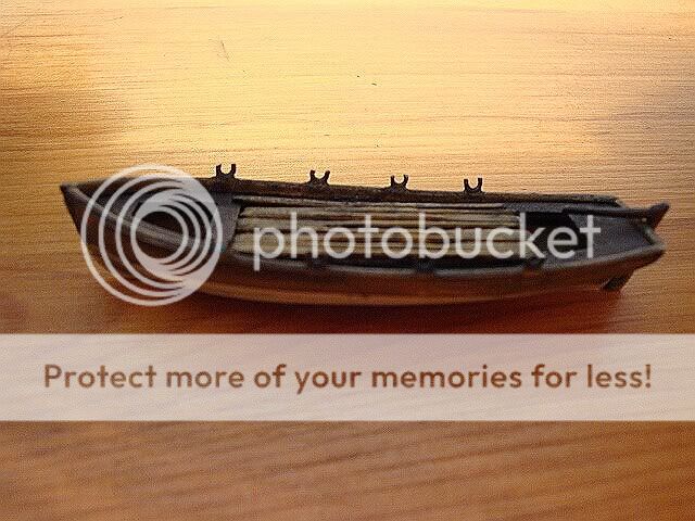 Das Beiboot konnte ich nun auch bereits fertig verzurren, da ich ja die Großmastbeting bereits belegt habe und nun da (hoffentlich) nicht mehr ran muß. Das Boot liegt übrigens unverklebt einfach in seiner Aufnahmme. Kann ja auch in keine Richtung weg und hält bloß durch das Tauwerk, falls es jetzt wen interessiert..?