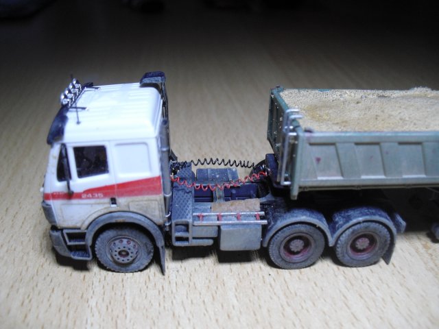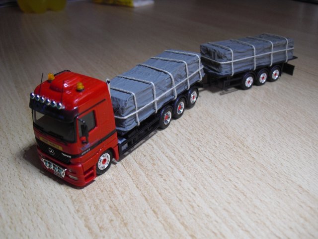 hallo leute, hier ma 2 neue, der thomsen hat nur farbige gläser vom lampenbügel bekommen, sowie ne dachklima bischen tiefer, der trailer hat noch ein schmutzlappen bekommen,das war es auch schon, der actros nur ne dachklima, der trailer noch ne dritte achse, die ladund sind dünne röhrchen die bischen farblich gestaltet wurden, hier ma die bilder.......