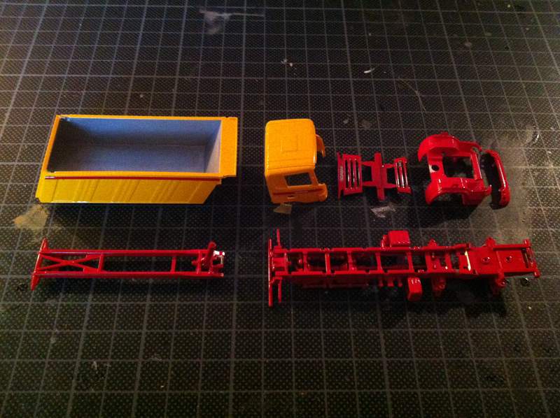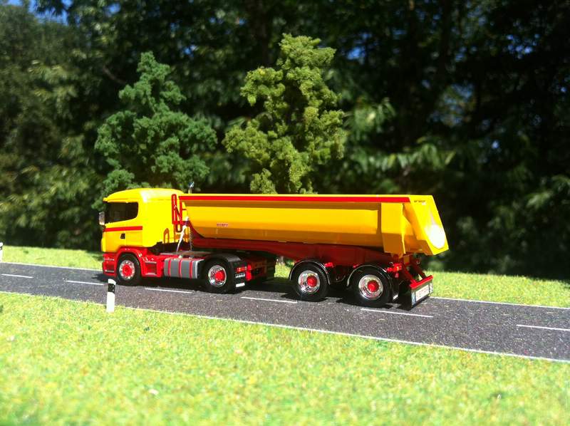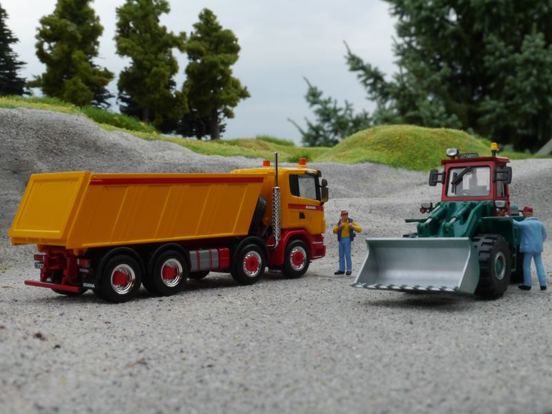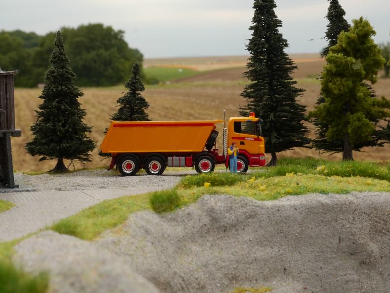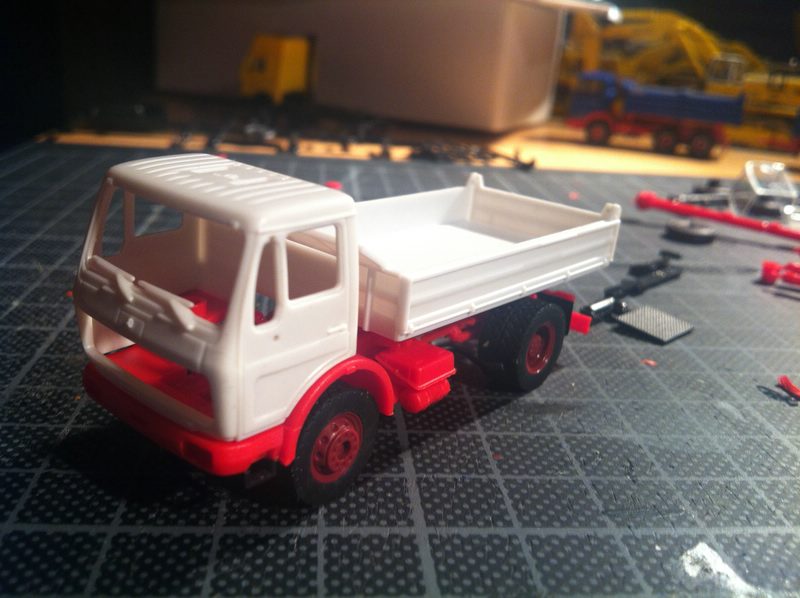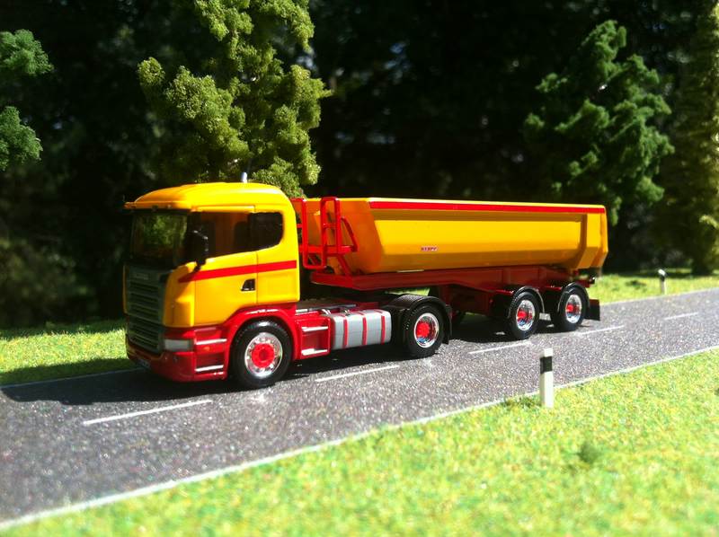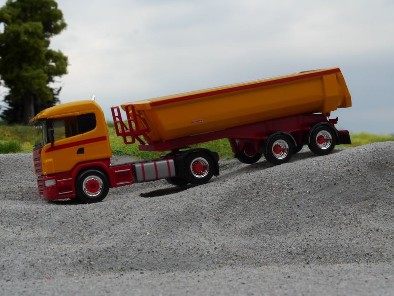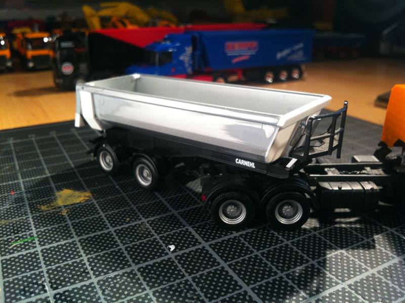 Für das Modell musste eine Kibri Actros Sattelzugmaschine mit Meiller Sattelkipper herhalten, die Kabine habe ich von Preiser,