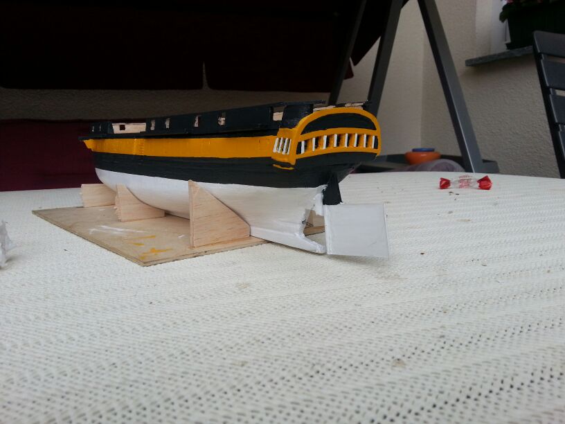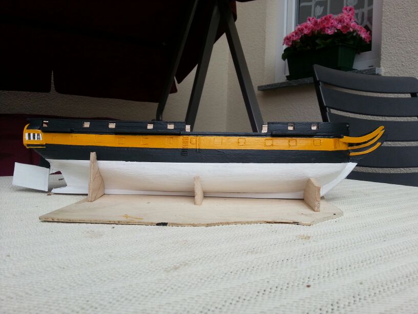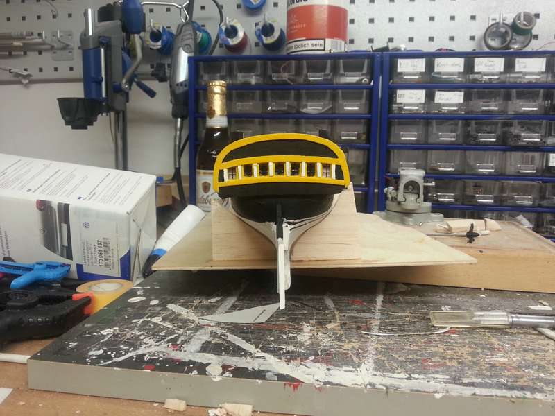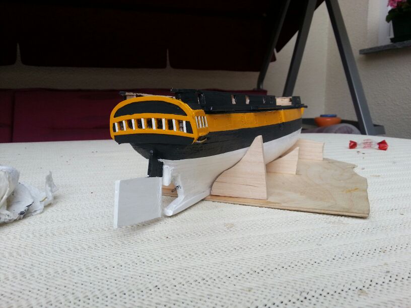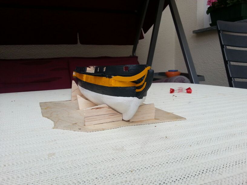 als erstes habe ich mir einen kleinen ständer gebaut, worin das Schiff bis zu 80° neigung immer noch hält.