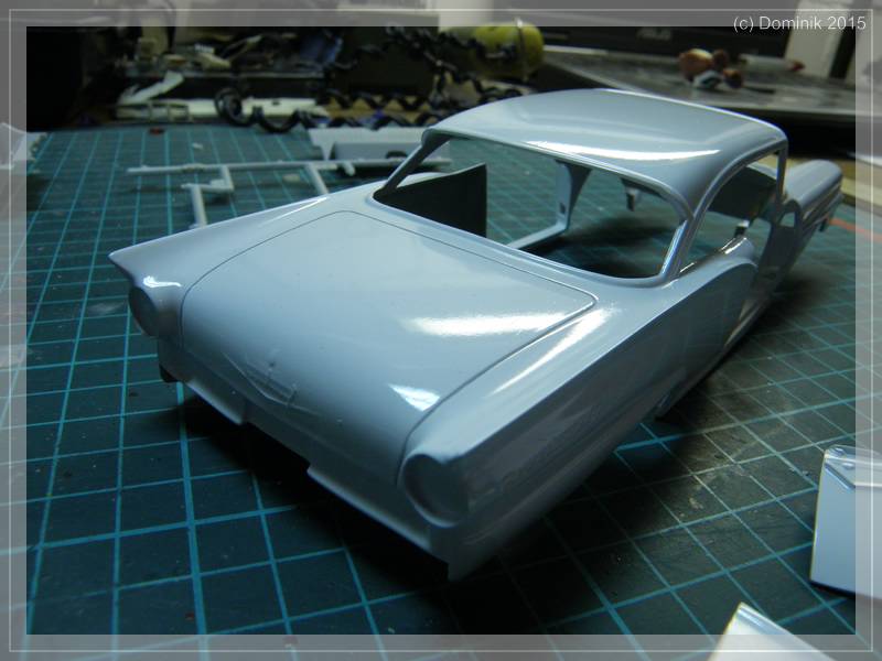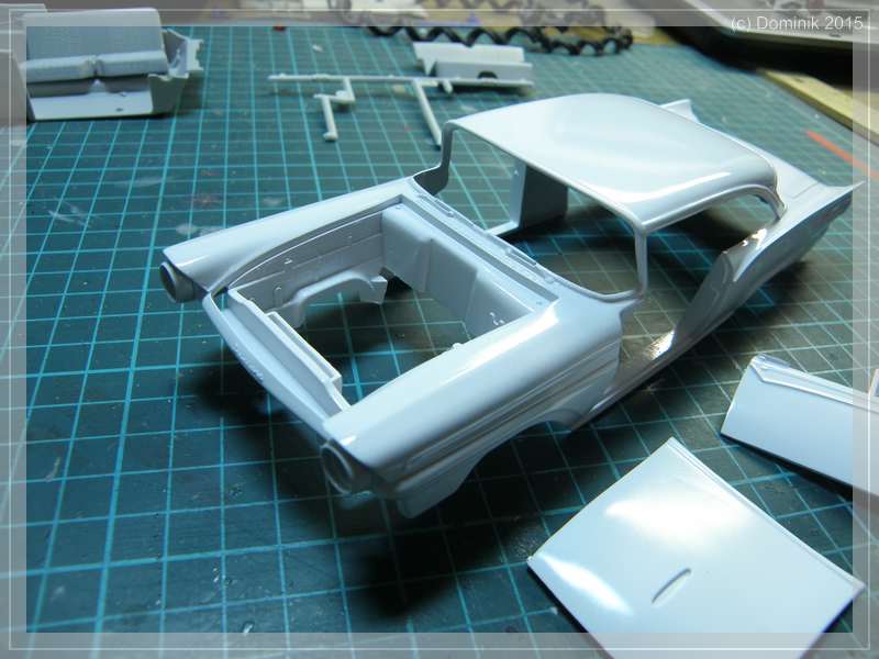 Body und Innenraum sehen docj schon echt gut aus. Die "Zweifarbigkeit" der alten Amis ist immer wieder schön. Jetzt bin ich gespannt, wie viel Bare Metal du aufbringen musst. Viel Spass und möglichst keinen Ausrutscher mit dem Skalpell auf dem Lack. Hast du die finale Klarlackschicht schon drauf?