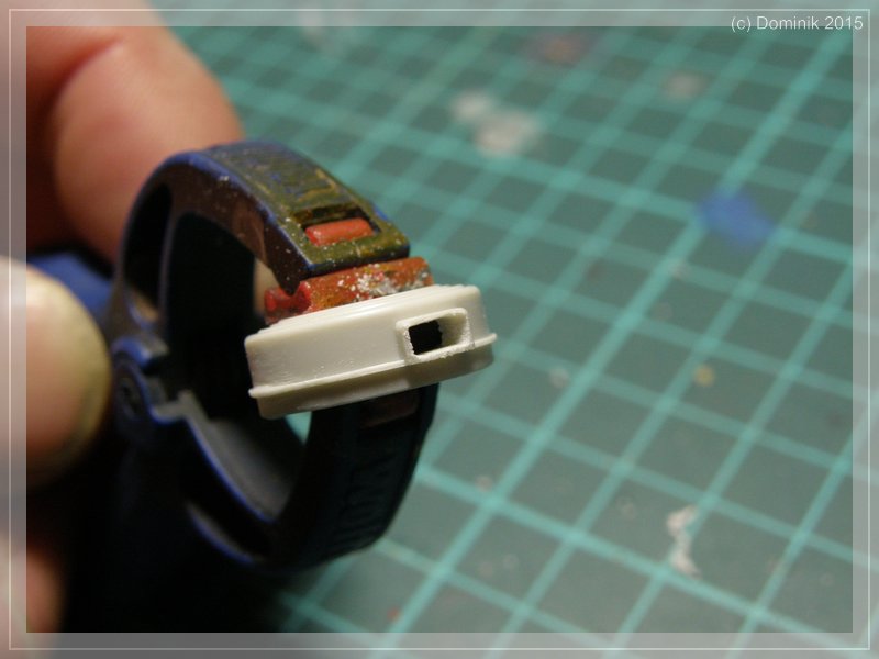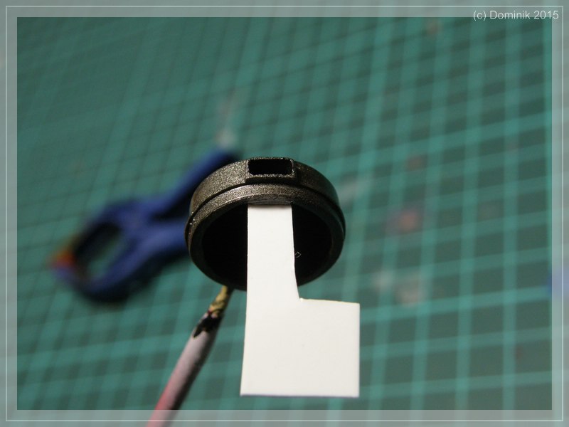 Das dieses Stück nicht wieder die mühsam gefeilte Öffnung verschließt, habe ich ein kleines Distanzstück eingeklebt...
