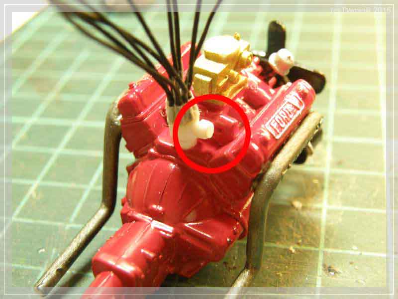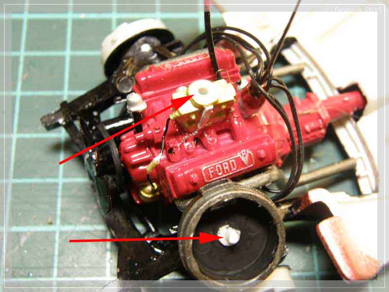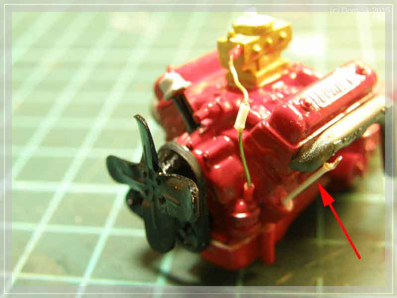 ...und am Platz von der Pumpe zum Vergaser verklebt. Auch im Bild (mit Pfeil): der Ölmeßstab.