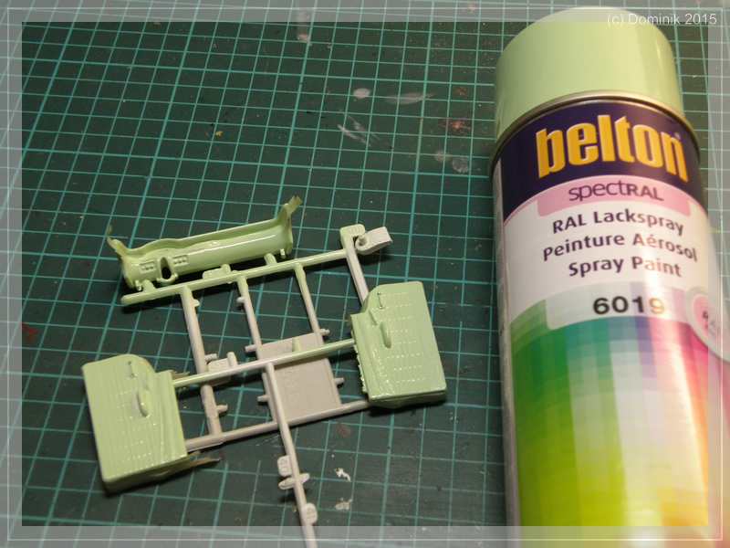 Die Lackfarbe (RAL 6019) ist eingetrudelt gewesen, so habe ich die verbleibenden, weißen Teilflächen der Innenausstattung abgeklebt und drauf mit der Farbe: