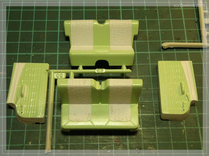 Ich vergaß noch. Die Innenraumblechteile sowie die Karosserieanbauteile wurden (ohne im Bild zu erscheinen) selbstredend mit weiß lackiert...die Sitze nicht! Die sind nur grundiert!