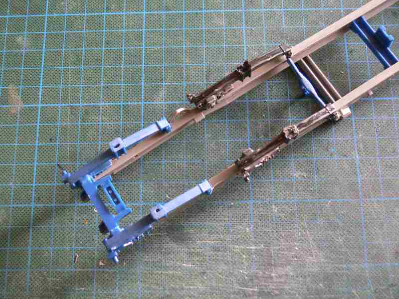 Gut, weiter geht es mit nun mit den Vorderachsen, zuerst wurden die zwei Federpackete für die zweite Vorderachse an den Rahmen geklebt.