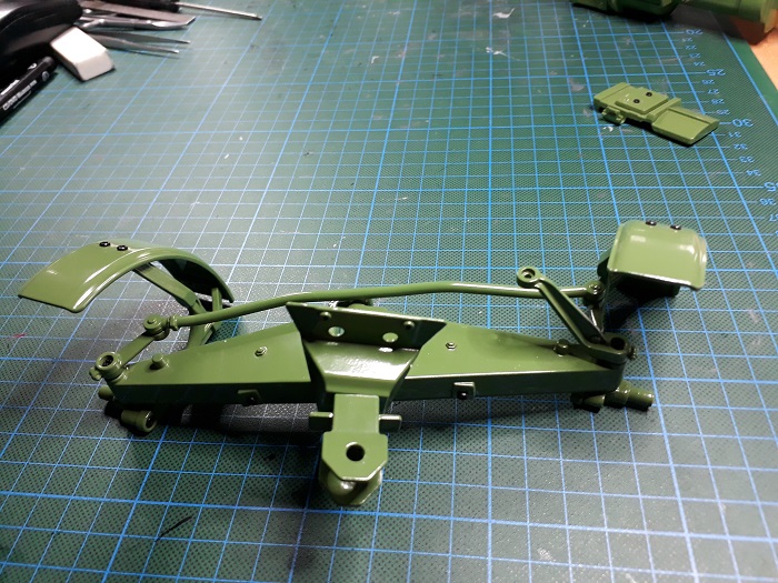 Danach wurde die Vorderachse mit den Radschutzblechen auseinander genommen. Um die beiden Sechskant Achsen klebte ich je einen dünnen Streifen Papier und
