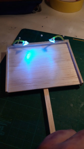Da es sich ja um ein Geschenk handelt, braucht’s natürlich auch einen entsprechenden Text, diesen habe ich als „Werbetafel“ am Straßenrand ausgeführt, ebenfalls aus 1,5 mm Balsaholz, doch ich wollte noch zwei Strahler „davor“ setzen, also brauchte ich entsprechende „Halter“ …