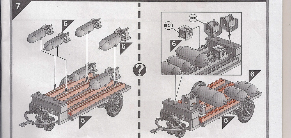 Denn hier muss man sich nun entscheiden ob die Bomben, längs zur Fahrtrichtung, fertig zum Verladen, oder Quer zur Fahrtrichtung, nur für den Transport, eingebaut werden, wie das dann aussieht kann man sich vorher schon in der Bauanleitung anschauen.