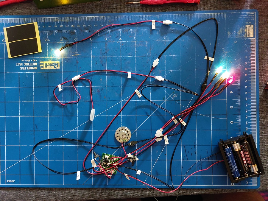 Sofort gingen alle Lichter an. Den Taster betätigt und sofort kamen Dampf- und Fahrgeräusche aus dem Lautsprecher. Der weiße Schalter hatte keinen sichtbaren Effekt, der