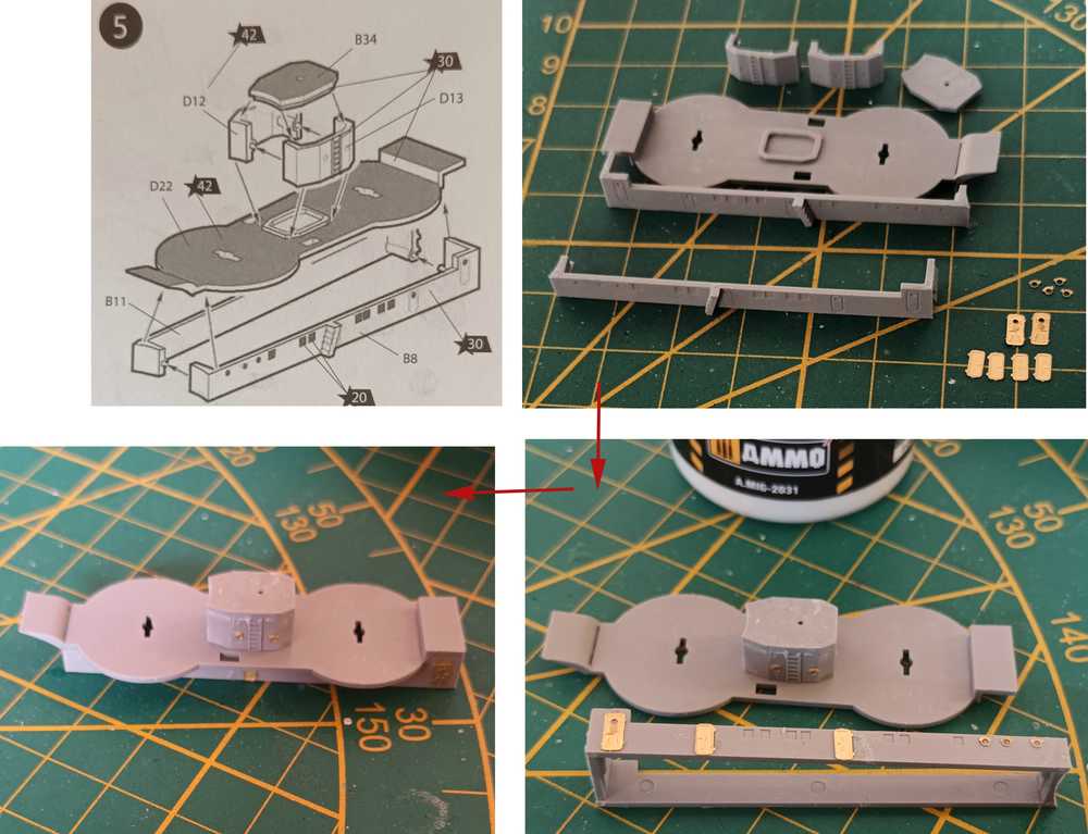 Um die Arbeitsschritte zu erfassen die Bildreihe bitte entgegen dem Uhrzeiger lesen, von links oben nach rechts oben (rote Pfeile). Zur Bemalung des Decks kamen folgende Farben zum Einsatz: Hellgrau (71.050), Neutralgrau (71.051), Seegrau (71.049), Tamiya Weathering Set 87080