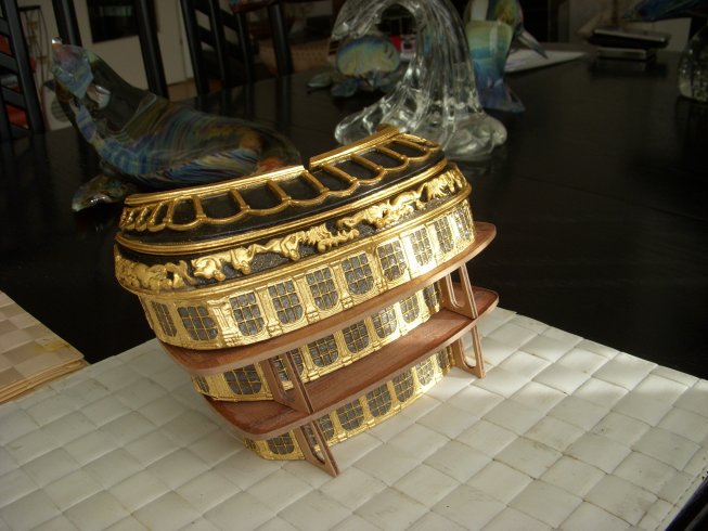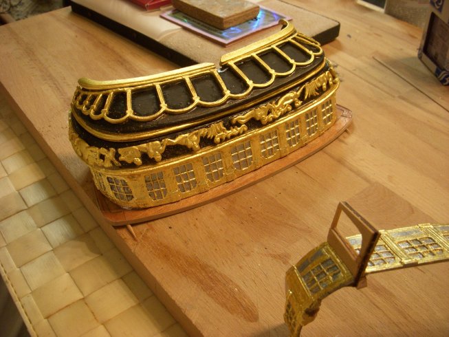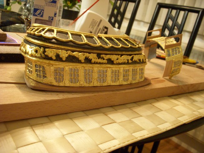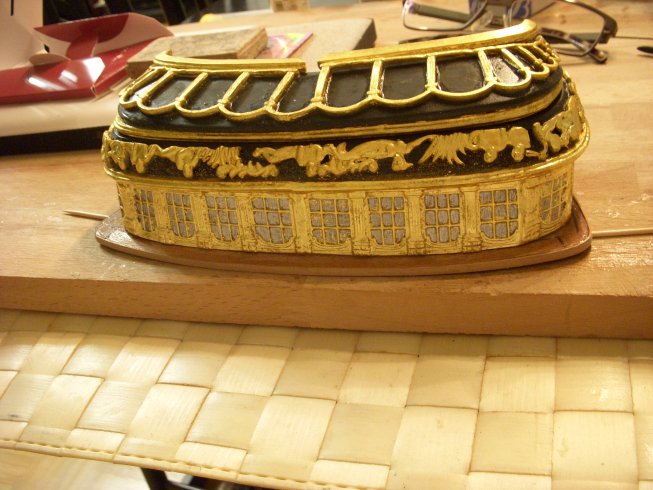 . Ich weiss im Moment nicht so ganz wie ich weiter machen soll, der Heckspiegel/Seitentaschen sind soweit eingepasst und könnten vergoldet werden->hab ich keine Lust, die Decke des obersten Balkones sollte gemacht werden->auch keinen Bock