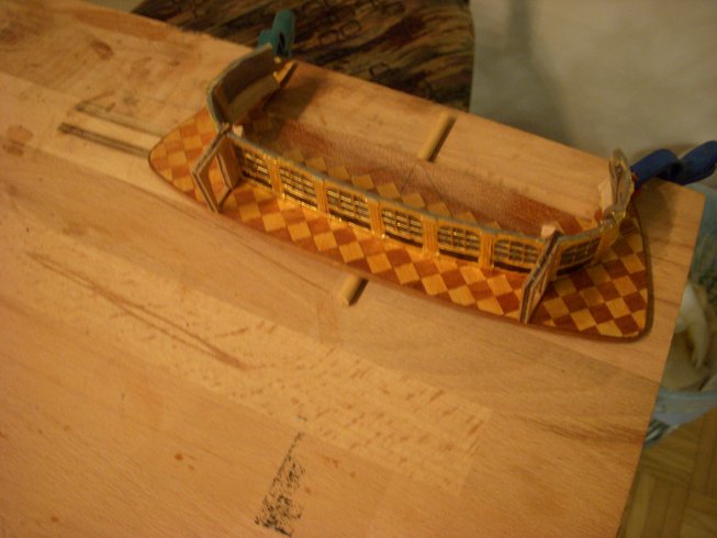 , die Balkonböden sollten mit einem Schackbrettmuster beplankt werden->noch kein Material (warte ich noch auf Post von Patsy189) und der Rumpf könnte final gespachtelt und geschliffen werden->keine Lust wegen Schleifstaub