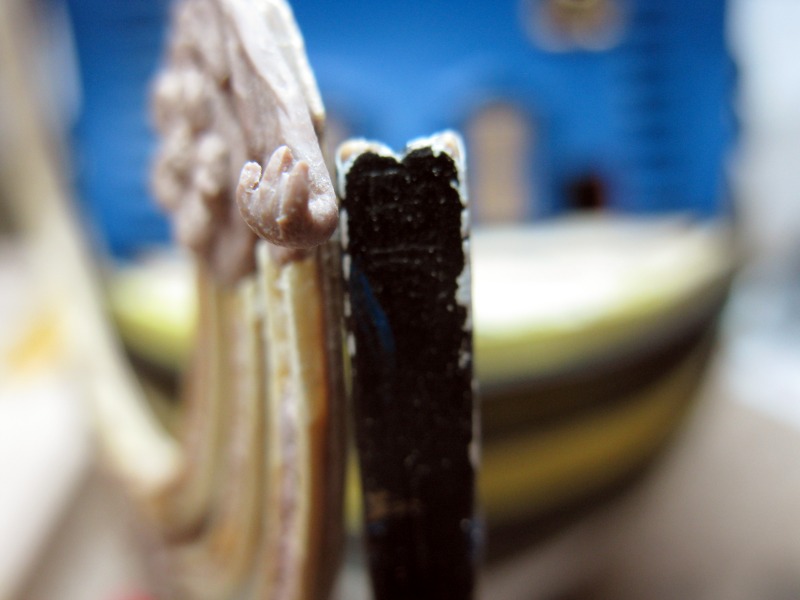 , aber erst mal diese Seite fertigmachen. Und bevor ich überhaupt ans Weitermachen denken konnte, musste erst mal die Befestigungsfrage geklärt werden. Ich wollte die Regeln so anbringen, dass ich sie, zumindest vorerst, wieder abnehmen konnte, da ich ja noch einiges an der Galion zu machen hab. So lässt sich einfach leichter dran arbeiten. Dazu hab ich mir folgendes ausgedacht: