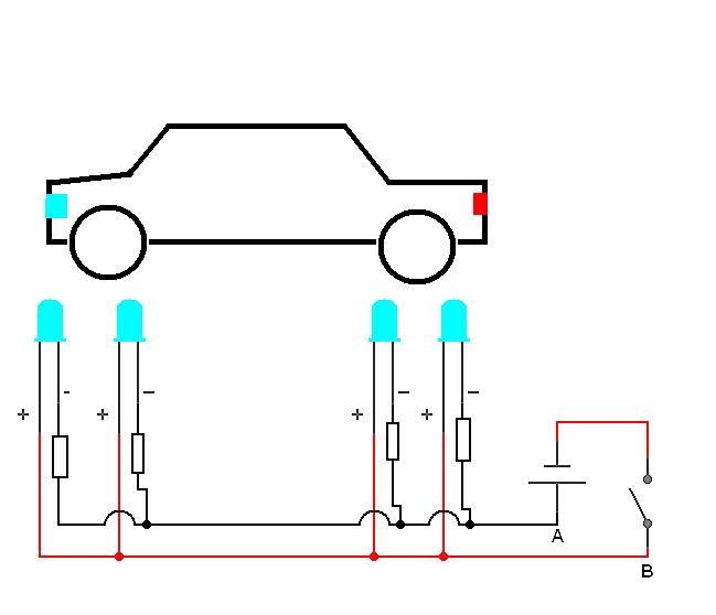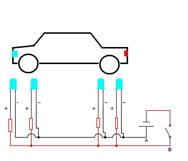Die LEDs für vorne und hinten mit den Minus-Polen an die Minus Leitung von der Batterie-box, und die Plus Leitung an die Zuleitung zum An-Aus-Schalter?