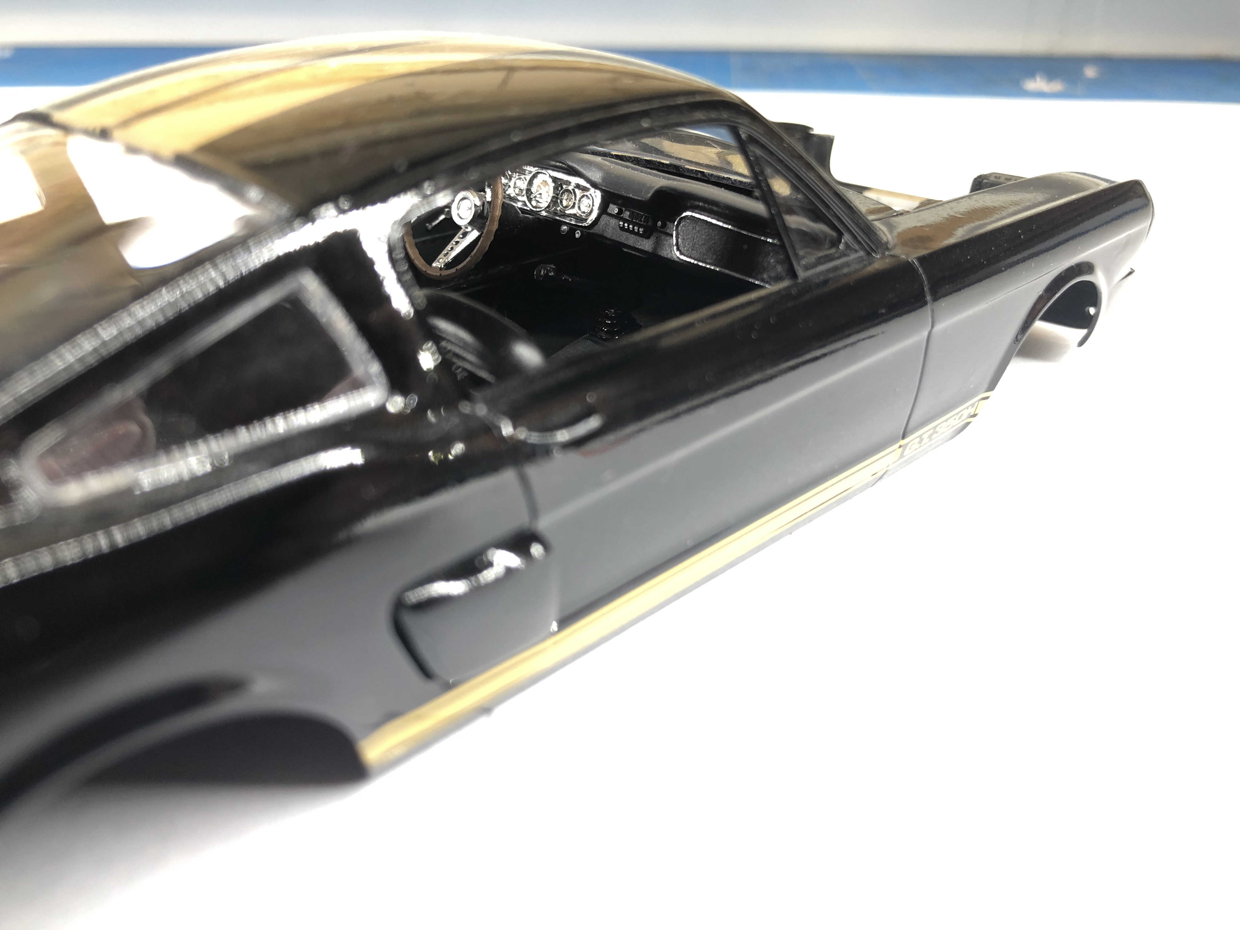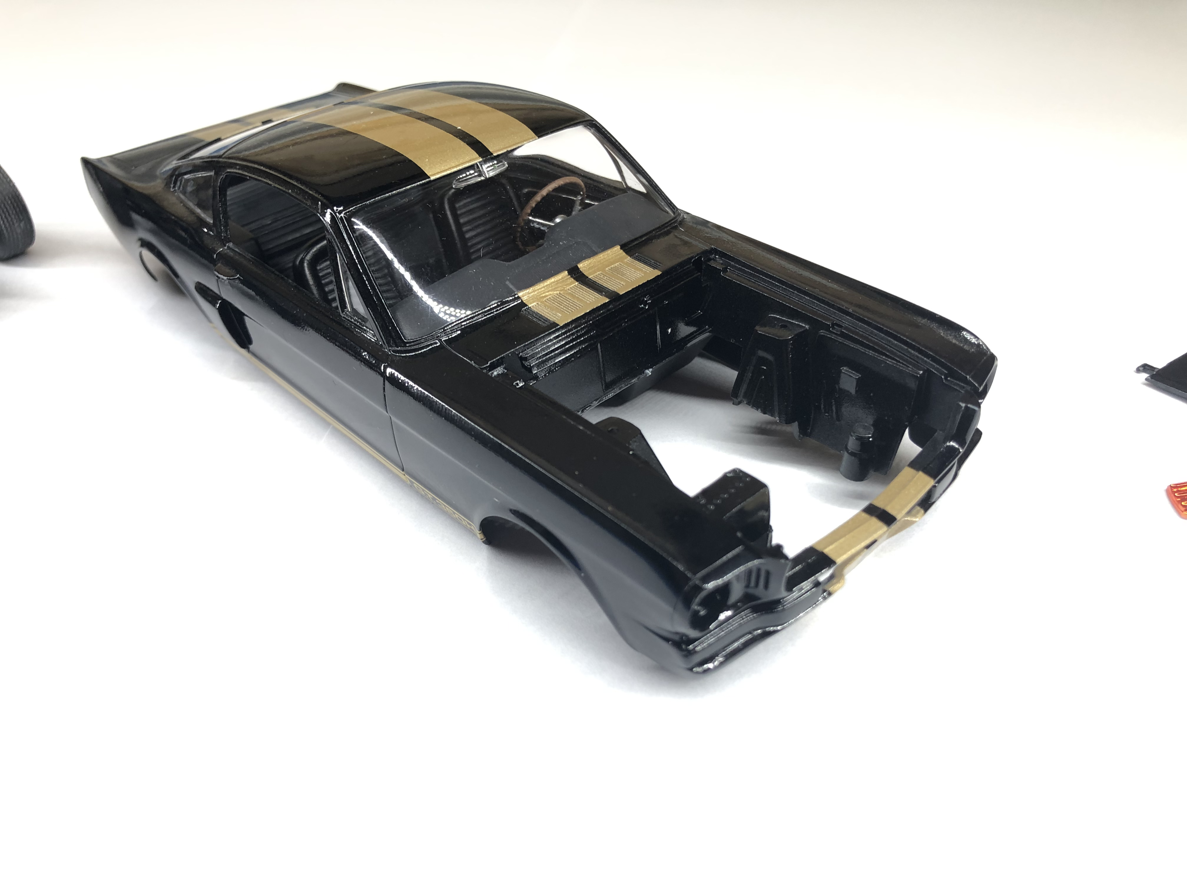 Im nächsten Schritt habe ich jetzt den Motor und den unteren Karosserieteil eingebaut. Außerdem sind die Scheiben dazu gekommen und der Innenraum ist mit der Karosserie verbunden. Die Rücklichter hab ich auch schon lackiert. Jetzt heißt es erst mal wieder alles trocknen lassen :-)