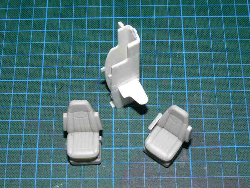 So nun aber zuerst die Einzelteile der Sitze, ist nicht viel. 2 Teile für die Gestelle, die sind schnell zusammen geklebt und je 2 Teile für die Sitze selber, sehr schön das man hier an einen Rücken gedacht hat, den man nicht selber bauen muss.