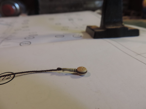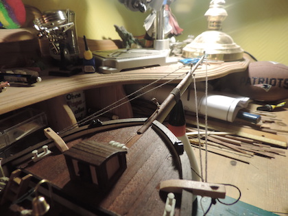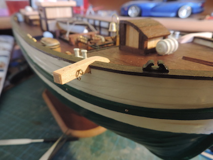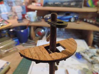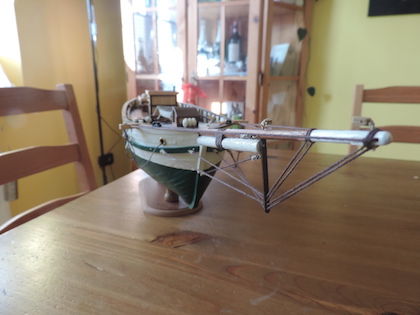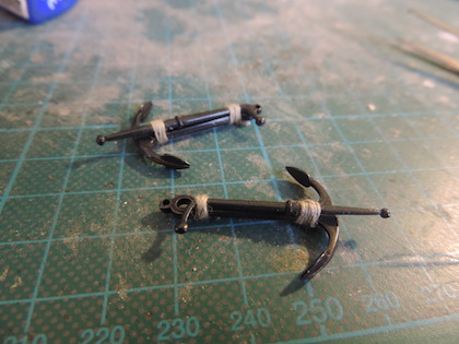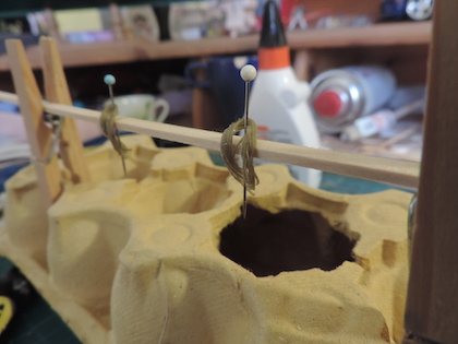 Die "Stopper" wo die das erste und zweite mal (von vorne gesehen) das Tau um den Bugspriet geschlagen wird, habe ich hinzugefügt. Laut Anleitung sind dort keine, was für mich aber unlogisch war.