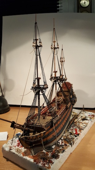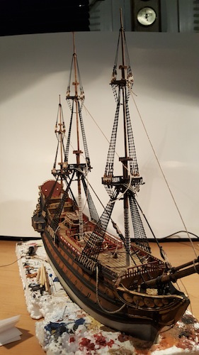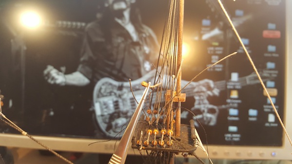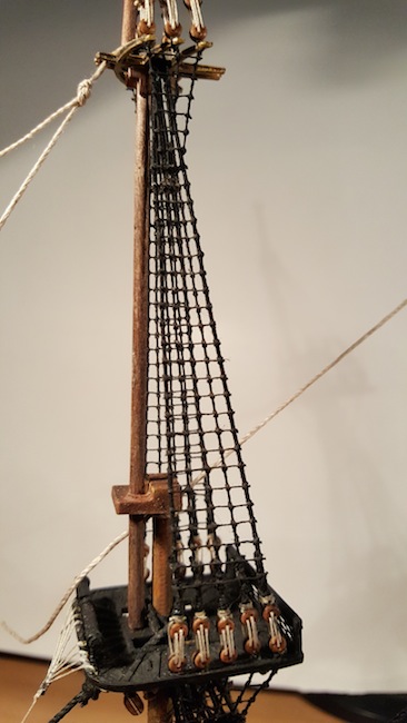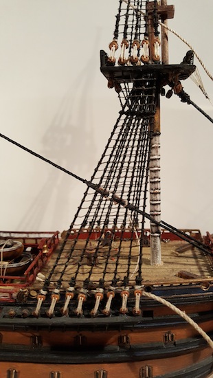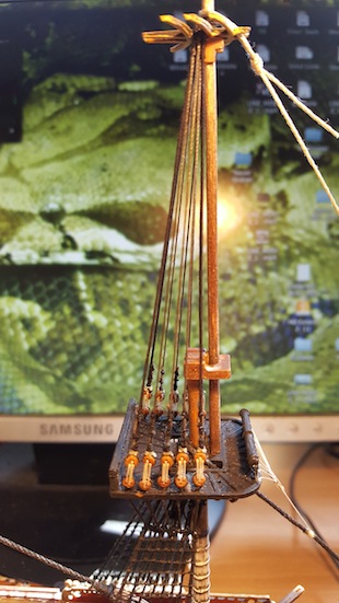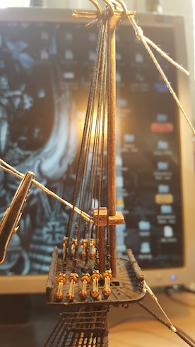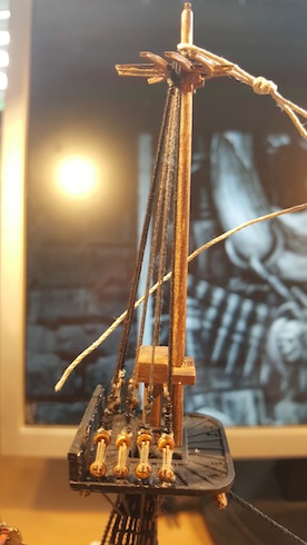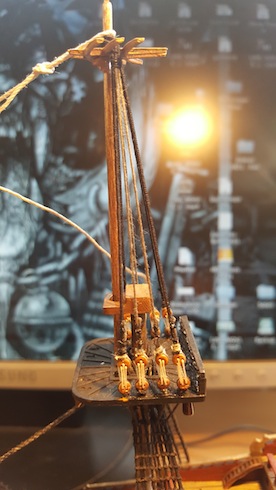 Habe ich schon probiert (bei Fußperden und Reffbändseln), das wird nur schwerlich was und die Gefahr des Versauens ist zu groß. Der Sekundenkleber trocknet meist zu dick auf, das sieht dann hinterher nicht gut aus und wirkt oft verkrustet, finde ich. Besser wäre z. B. verdünnter flüssiger Tapetenkleister. Damit lässt sich das durchfeuchtete Garn mit einem Pinsel ganz brauchbar modellieren. Aber ein perfekter und der Realität weitgehend entsprechender Durchhang kann auch damit nicht vollkommen erzielt werden. Wie das Ergebnis aber dennoch ausfällt, könnt ihr an meiner Reaper sehen, dort habe ich diese Methode verwendet. Zum Teil habe ich aber auch einfach nur stark verdünnte und sehr wässrige Plakafarbe genommen, selbst das ging bei Baumwollgarn (meine Webleinen) ganz gut und gab nach dem Trocknen ein ganz brauchbares "geteertes" Finish.