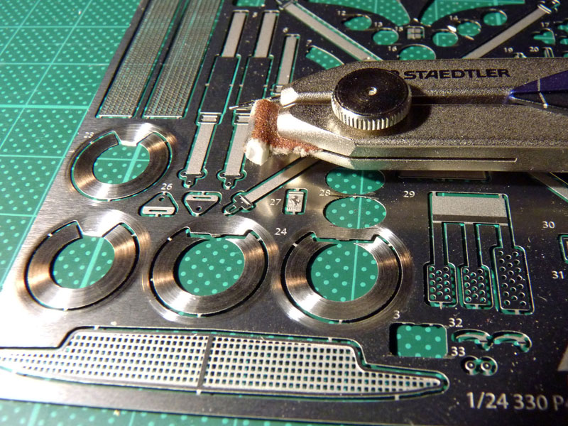 Am Wochenende habe ich mit der Verarbeitung von einigen Ätzteilen begonnen. Als Erstes habe ich die Bremsscheiben mit Einlaufrillen versehen.