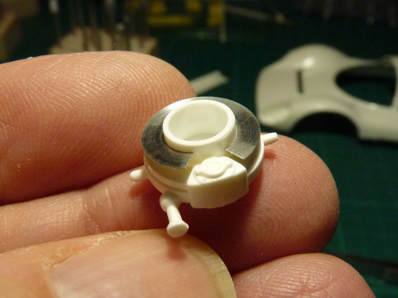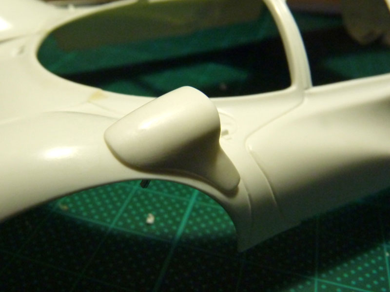 Wie eine Recherche ergeben hat, war das Spiegelgehäuse am Originalfahrzeug auch nur aufgesetzt und mit Schrauben befestigt, also nicht verspachtelt und verschliffen. Insofern ist die Vorgehensweise mit dem aufgesetzten Gehäuse auch realistischer und das Verkleben innerhalb des Kotflügels hinterlässt keine Klebespuren im sichtbaren Bereich.