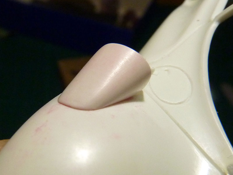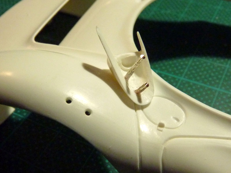 Im Bauplan war vorgesehen den Flügel auf Stoß an die Karosserie zu kleben, was aber nicht sehr vorteilhaft ist. Erstens hätte so eine Verklebung nur von jetzt auf gleich gehalten und zweitens, wie man schon auf dem Bild erkennen kann, wäre alles mit Klebstoff verschmiert gewesen.