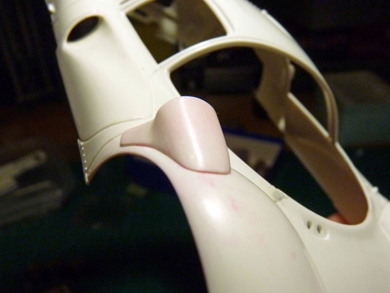 Weiter geht es mit dem Ausdünnen der Radkästen. Später werden die dünnen Kanten dem Modell ein grazileres Aussehen verleihen. Das Ausschleifen war etwas schwierig, da der Radlaufausschnitt aus jeweils drei Teilen besteht.