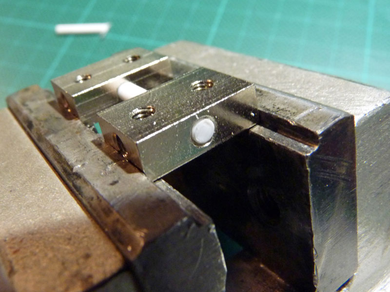 Zuerst habe ich den Rahmen angebohrt und dann auf die Bohrung die Muttern mit zurechtgeschnittenen Plastikstücken verklebt.