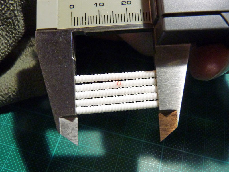 Die entsprechende Länge der Kühlrohre wurden dann mit dieser abgebildeten Konstruktion festgelegt. Die beiden Klötzchen haben ein M3 Innengewinde und wurden auf der Gewindestange gedreht. Nachdem der festgelegte Abstand eingestellt war, wurden die Klötzchen in einen Schraubstock fixiert und die Gewindestange herausgedreht.