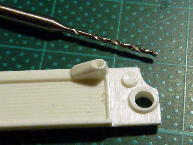Hier erstmal die Feinbearbeitung der Außenspiegel. Auf der linken Seite ist das Gehäuse schon fertig bearbeitet. Den unteren Rand der Spiegelfläche habe ich etwas gekürzt, damit es später nicht unter dem Spiegelätzteil hervorschaut.