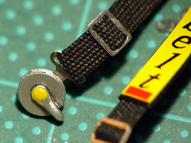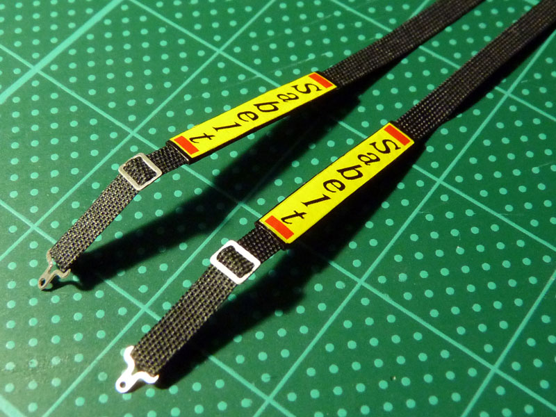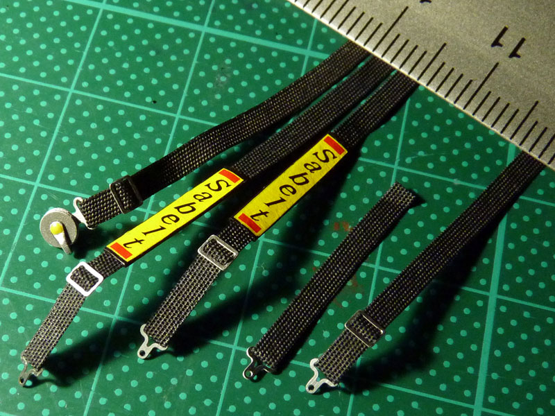 Wie schon angekündigt, geht es diesmal mit den Sicherheitsgurten weiter. Dem Bausatz lagen hierfür komplette Ätzteile bei, aber auch einige Teile für den Selbstbau, welche ich benutzen möchte. Ausgangsbasis war der Stoffbezug eines alten schwarzen Regenschirmes, aus dem ich die Gurte geschnitten habe. Damit der Stoff seine Form behält und beim Zurechtschneiden nicht ausfranst, habe ich ihn vorab mit seidenmattem Klarlack imprägniert. Meine Referenz für den 5 Punkt Gurte war die Abbildung eines alten Sabelt Gurtes, welchen ich im Internet gefunden habe. Hier nun die Bilder der Bastelei: