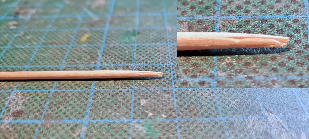 Um diese Hebelchen mit Spuke und Zahnstocher anzubringen, sind sie doch etwas zu schwer, rutschen immer wieder runter, also meine erste Lösung, den Zahnstocher vorne an der einen Spitze mit dem Cutter einschneiden.