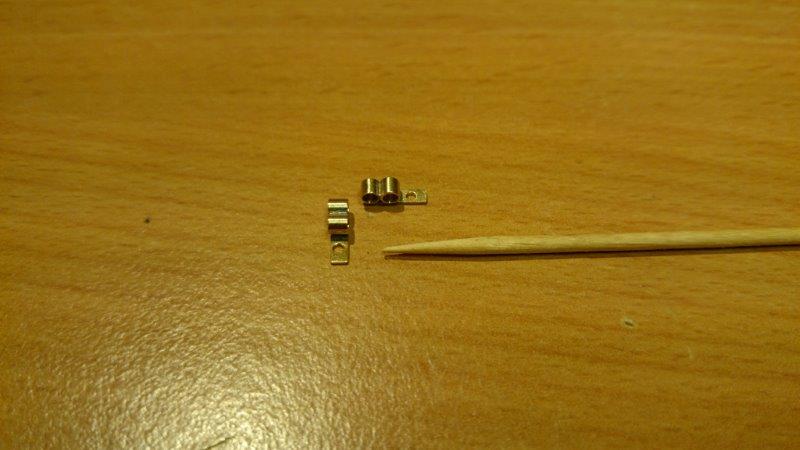 Das sind die Halterungen der Ölleitungen der hinteren Stoßdämpfer. Die Rohre hab ich gedreht. Sie haben einen DM von 2,3mm und eine Bohrung von 1,8mm. Die Länge ist ebenfalls 2,3mm. Wer solche Dinge schon gedreht hat der weiß wie fummelig das ist. Ablängen mit der Drehbank geht (zumindest auf meiner) nicht. Ich hab sie mit einer Diamanttrennscheibe abgeschnitten und gefeilt und dann auf einen 2mm Messingstreifen gelötet. Das Ganze hat 2 Stunden gedauert und ich hab mir gedacht, dass mir ziemlich langweilig sein muss wenn ich für diese "unwichtigen" Teile so viel Zeit aufwende.