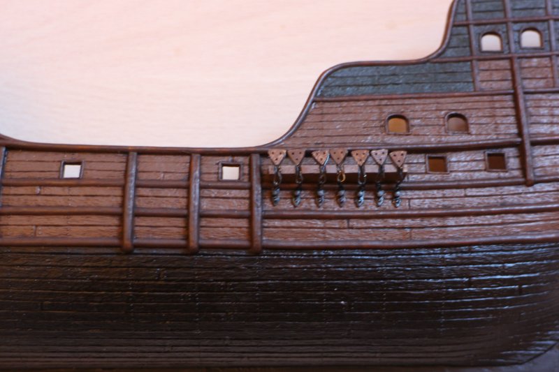 Ja, und zwar ein Stück weiter achtern als das letzte Wanttau, wie auf dem Bild der Victoria-Replik zu sehen ist. Binnebords neben dem Schanzkleid. Eine Positionierung der Augbolzen auf den Rüstbrettern kam m. W. erst später auf.