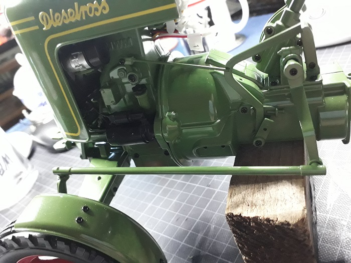 die Verbindungsstange (eher ein "Stangerl"...) vom Kupplungspedal zum sog. Spaltölfilter biegt sich auch beim Original ein wenig durch, wenn die Kupplung ganz durchgetreten wird (dann werden nämlich über einen Ratschenmechanismus die im Ölkreislauf des Motors gelegenen Filterlamellen durch die Schubbewegung der Stange gegeneinander bewegt, um den Ölschlamm abzustreifen) - das Durchbiegen ist also fast vorbildgetreu. Der Spaltölfilter sieht im Original so aus: