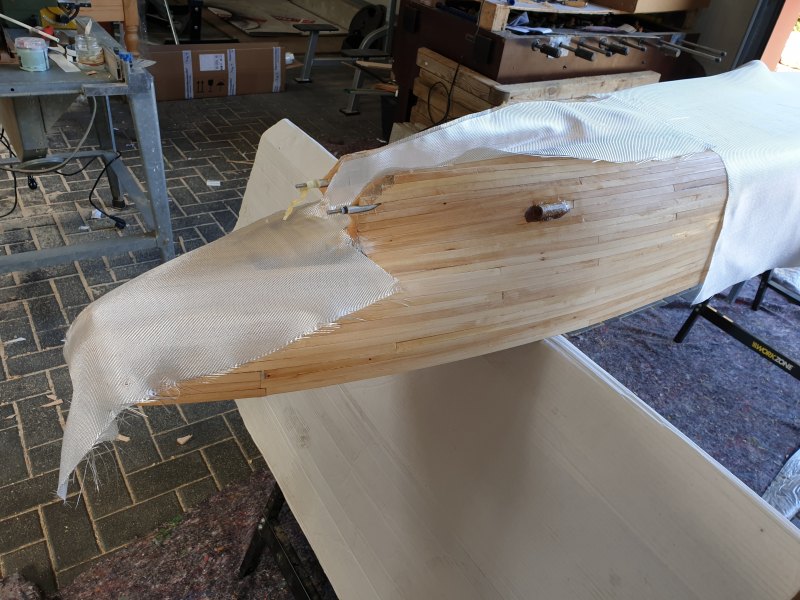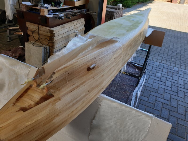 Beim Gewebe habe ich die verschiedensten Angaben gefunden was man für einen Holzrumpf in ähnlicher Größe nehmen sollte. Entschieden habe ich mich für eine Lage 163g und eine Lage 80g Gewebe.