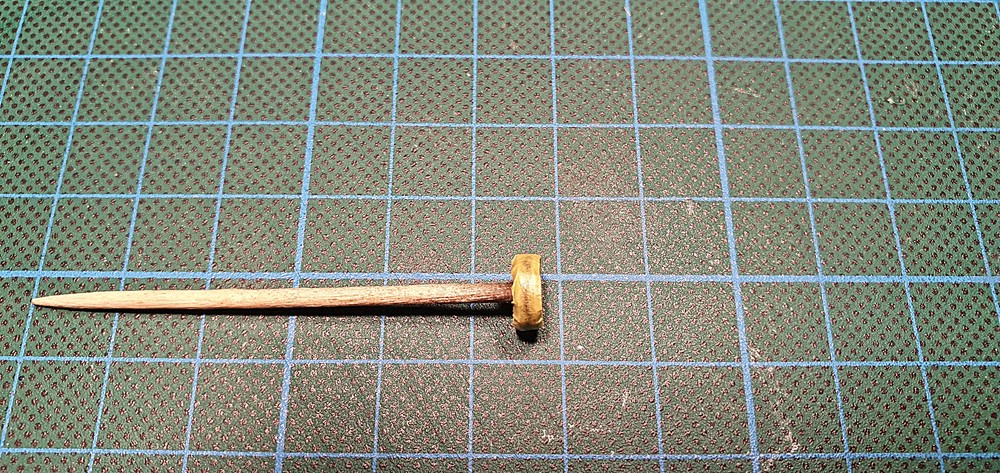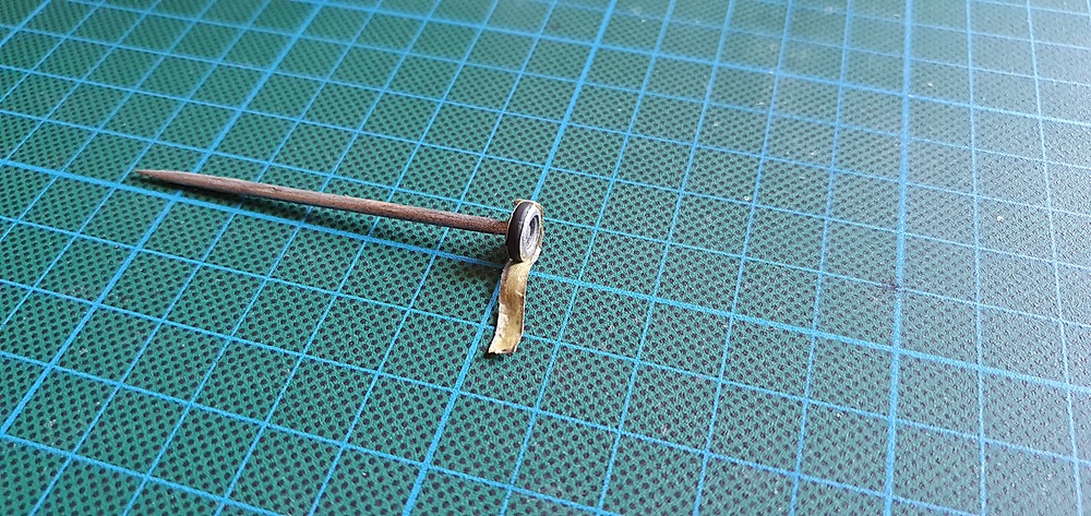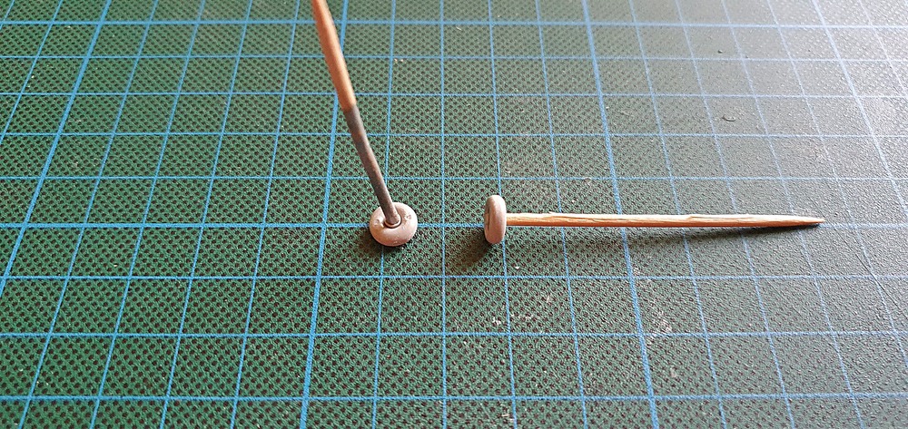 Nun also zu erst, die zu bearbeitenden Räder, auf Zahnstocher aufspießen und loslegen, zu erst die beiden Räder vom Bugfahrwerk.