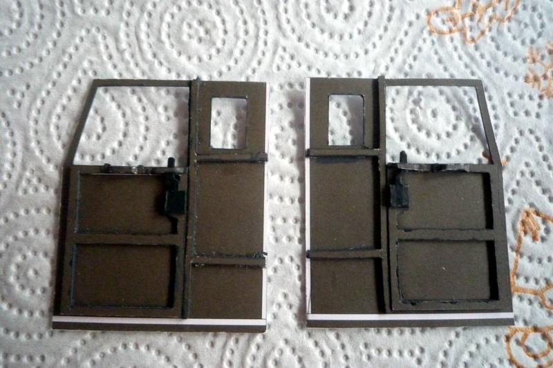 Aber weiter im Text. Auf den inneren Türen wurde die Hühnerleiter gerichtet, die Türpappen aufgeklebt, danach die Türöffner und dann noch jeweils ein Bögel darüber sowie daneben jeweils ein Türgriff. Somit sind die nun von der Innenseite her fertig gestellt: