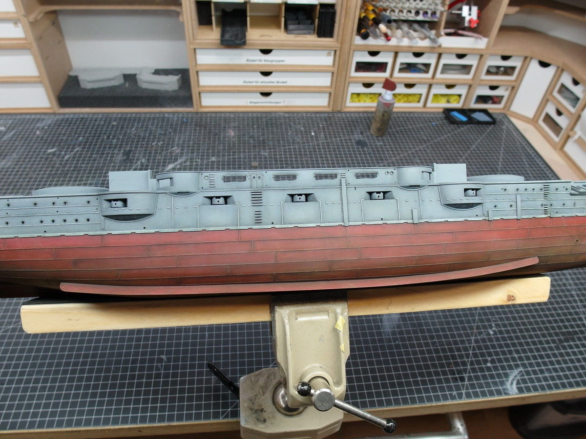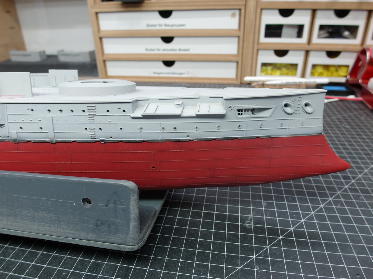 Es standen die letzten Details an, die ich vor dem Lackieren anbringe. Bei mir sind es immer nur recht wenige. Das meiste wird erst ziemlich zum Schluss verarbeitet. Dazu gehören die Gitter vor den Bug und Heck Kanonen und natürlich die Steigeisen.