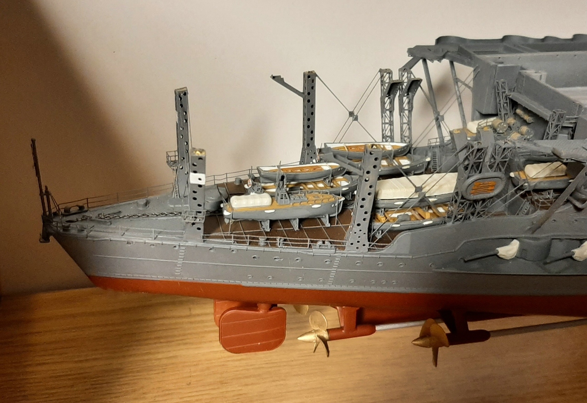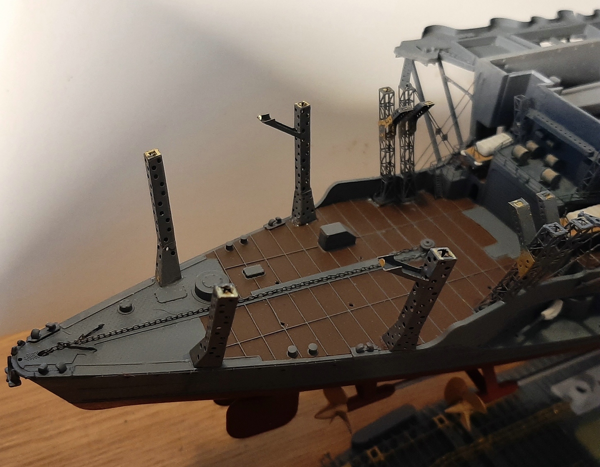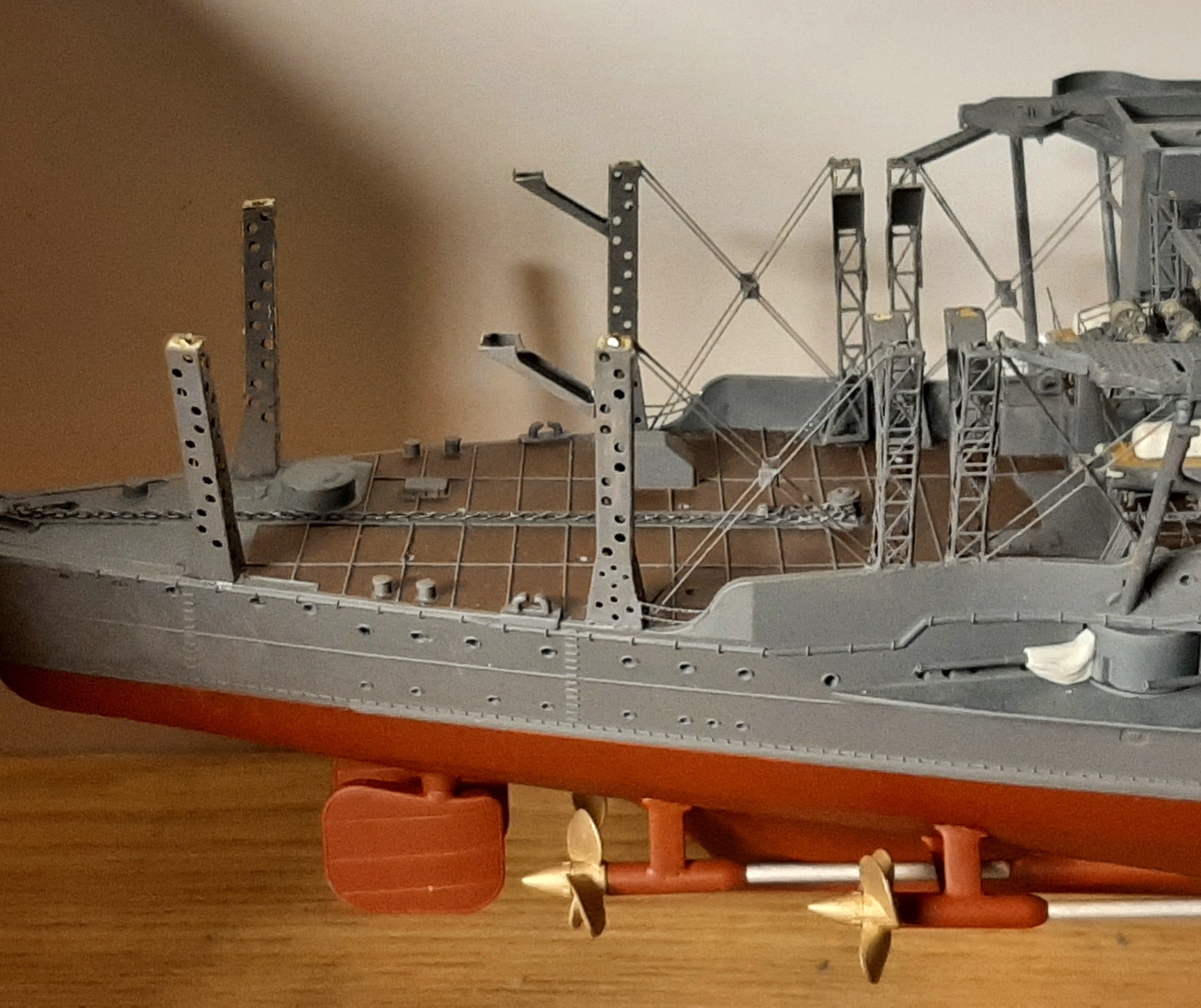 Weitere Details: Das Kreuz am Flaggenstock (der damit als Flaggenstock funktionslos wird) ist kein satanistisches Symbol, sondern eine Signaleinrichtung für Verbandsfahrten bei Nacht. Üblicherweise hing das Teil hoch oben im Großmast, aber wo es nun mal keinen Großmast gibt.. Diese Position war sicher nicht ideal, von der Brücke eines folgenden Trägers aus dürfte das kaum zu sehen gewesen sein. Rätselhaft, warum man es nicht wenigstens unter das Flugdeck gehängt hat.