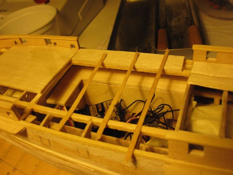 Mal ein Probedecksstück aufgelegt (liegt durch seine Eigenwölbung nicht richtig auf den Decksbalken auf), was von der Farbe ganz ungefähr dem entspricht was mir vorschwebt: