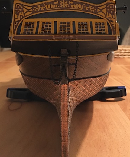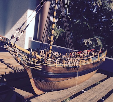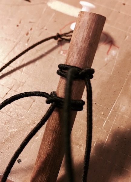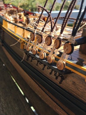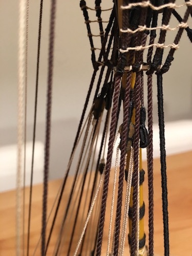 Ich würde allerdings zunächst alle Masten aufbauen und seitlich mit den Wanten festsetzen, dabei gleichzeitig Stage und Pardunen anbringen. Das hat den Vorteil, dass man die Kräfte, die die einzelnen Taue auf die Masten und Stenge ausüben, gut aufeinander abgestimmt regulieren kann.