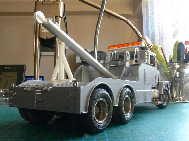 Am späten Nachmittag, nach dem das soweit trocken war, habe ich den Abschleppbalken mit Halterung und Stütze auf den Aufbau gesetzt, aber noch nicht verklebt, es dient mir so jetzt erst mal zur Ansicht um dann den weiteren Verlauf der Lackierung besser Planen zu können.