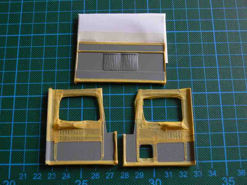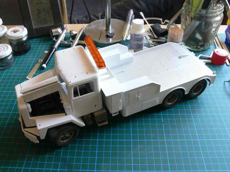 Sowie die Unterkante vom Wreckeraufbau, wobei ich mir hier noch nicht so sicher bin ob ich komplett über den Kotflügeln lackiere und dann schräg abfallend am hinteren Radausschnitt, oder da nur die Hälfte der Radausschnitte und schon schräg nach hinten und nach unten abfallend, beginnend an der vorderen Kante des Aufbaues.